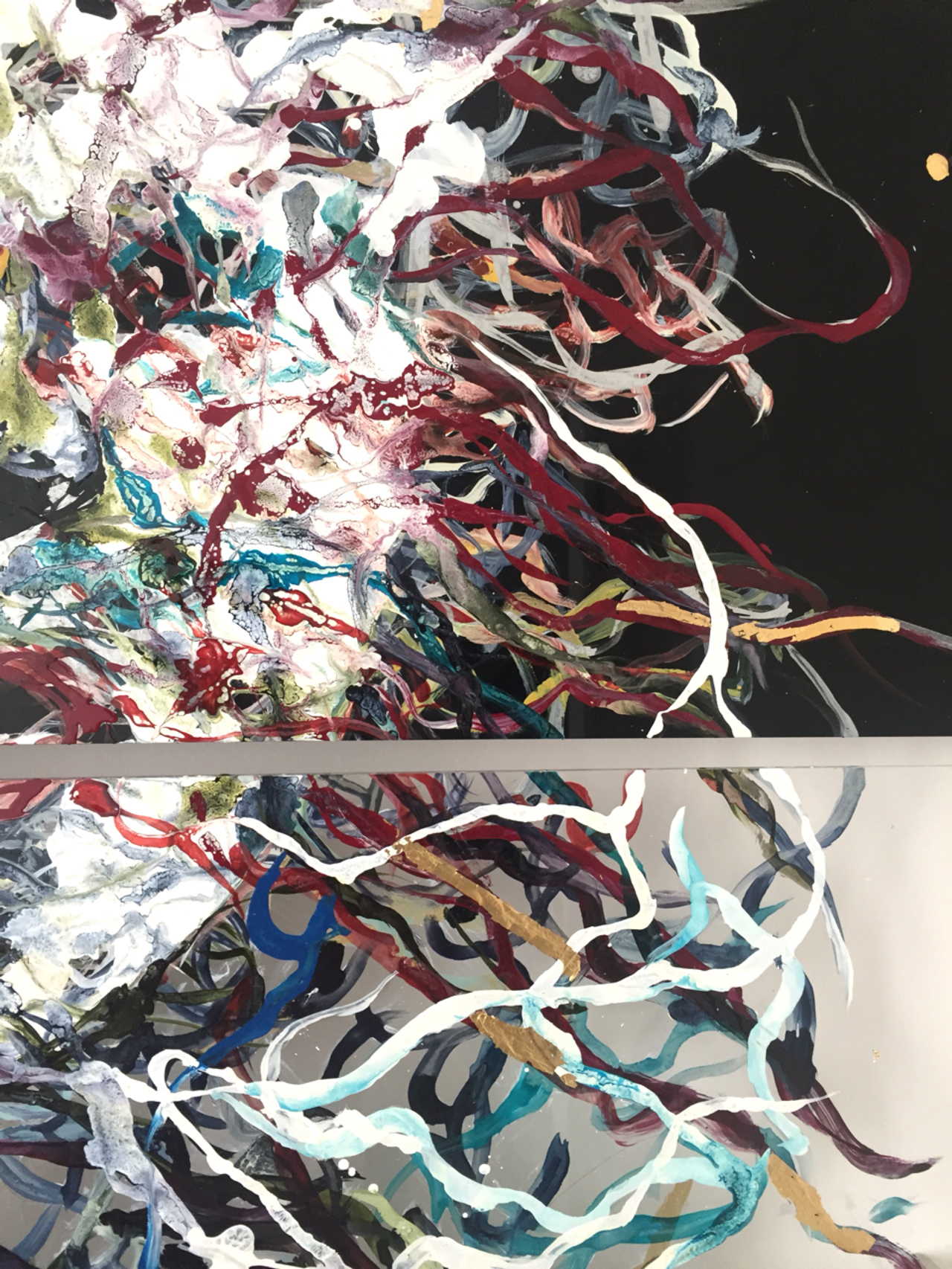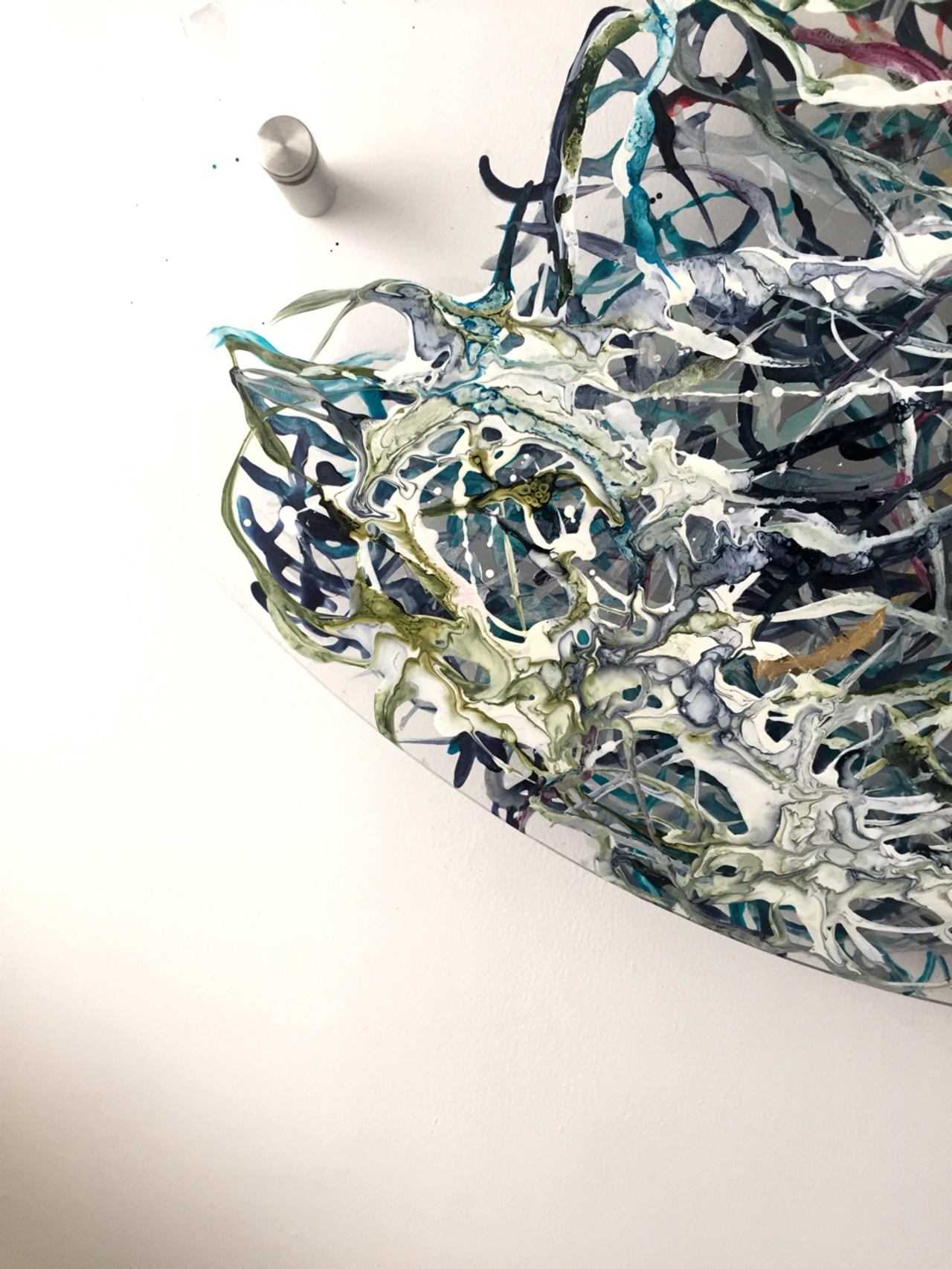CERAMIC PAINT AND GOLD LEAF ON ACRYLIC.